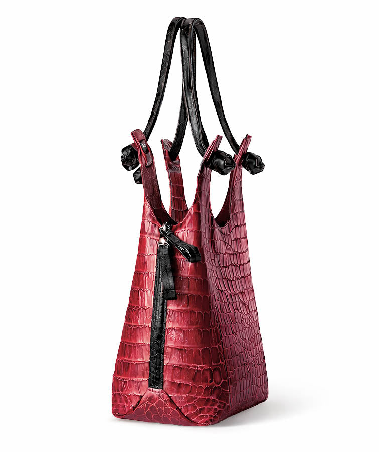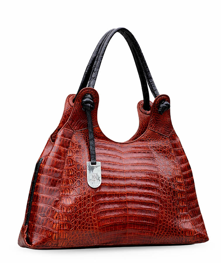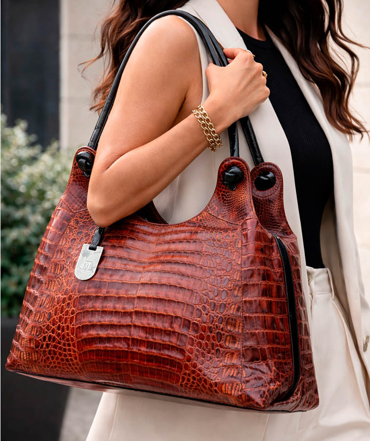 Be the envy of the club with the stylish Palmi handcrafted in luxurious crocodile skin. The zipper top entry opens to a roomy fully lined interior with drop in pockets, a zippered wall pocket and key leash. The contrasting rolled straps add style and provide for ease of carry on the shoulder or over the arm.