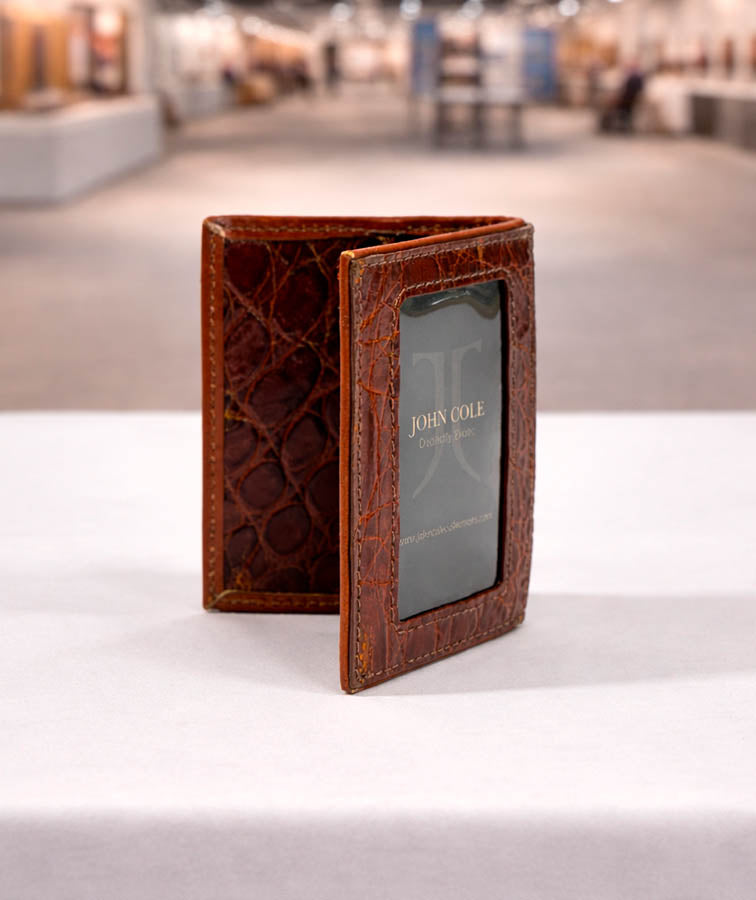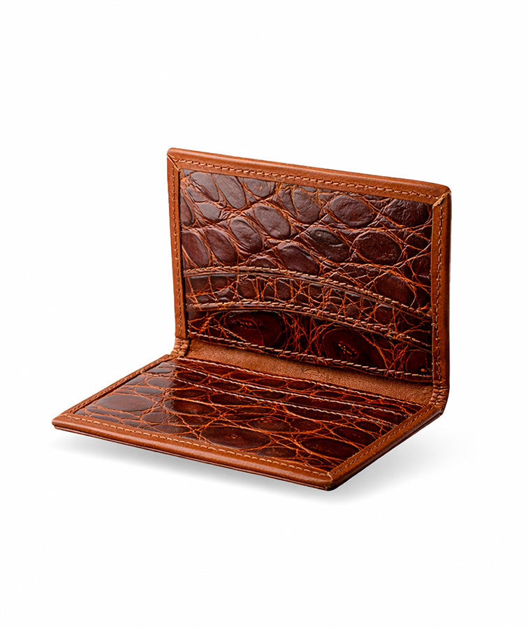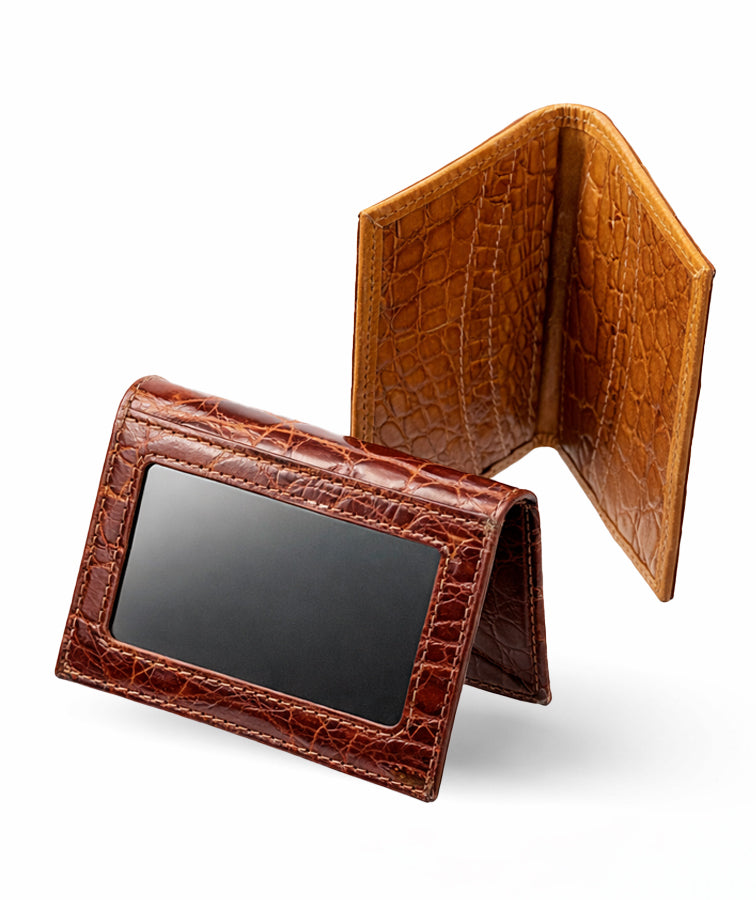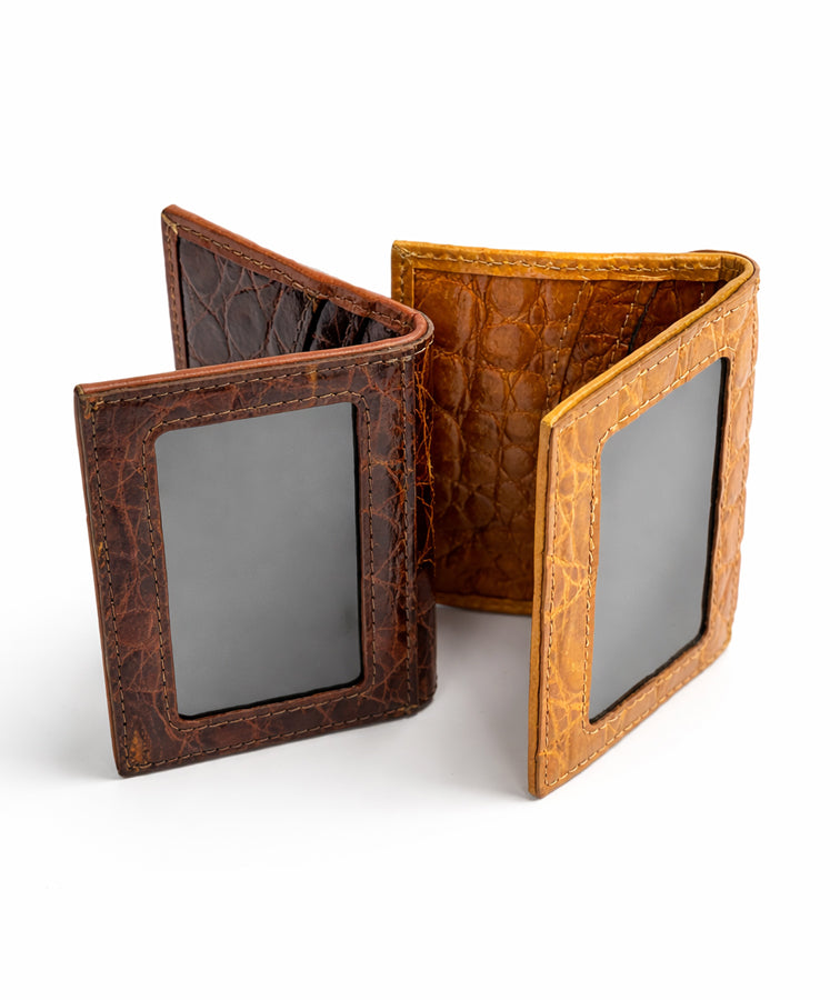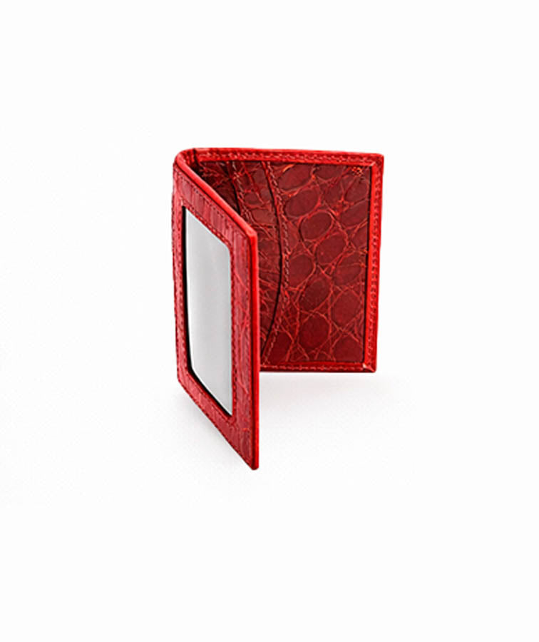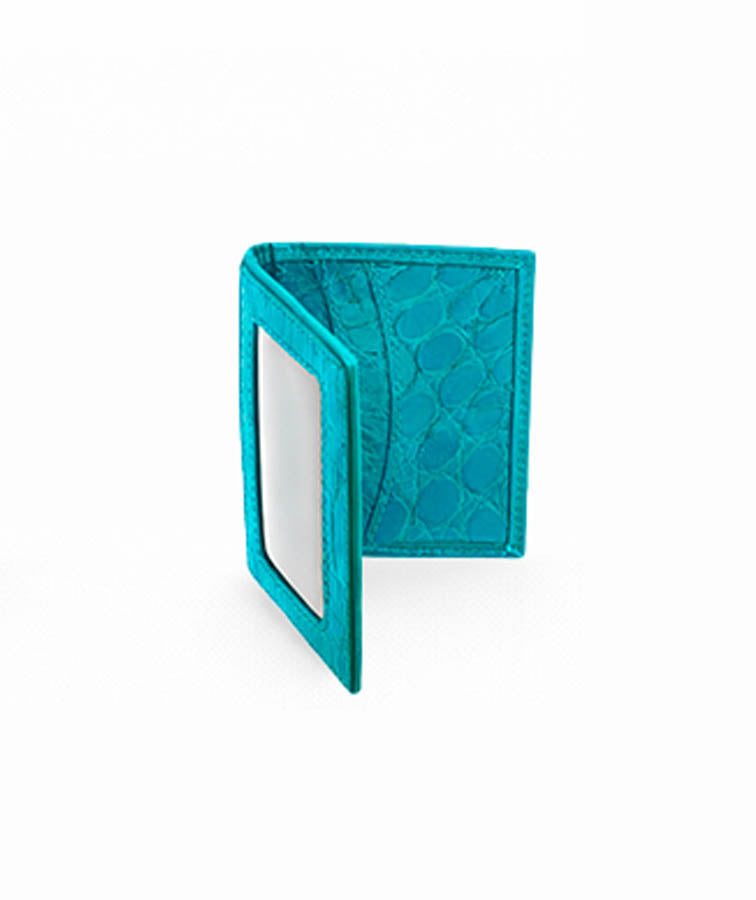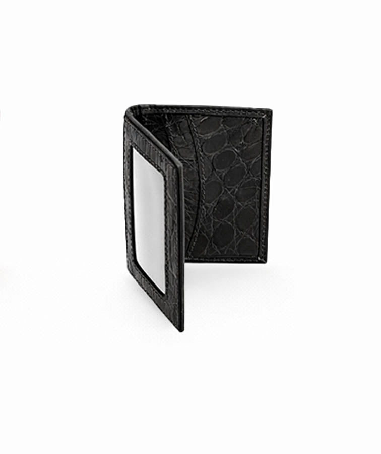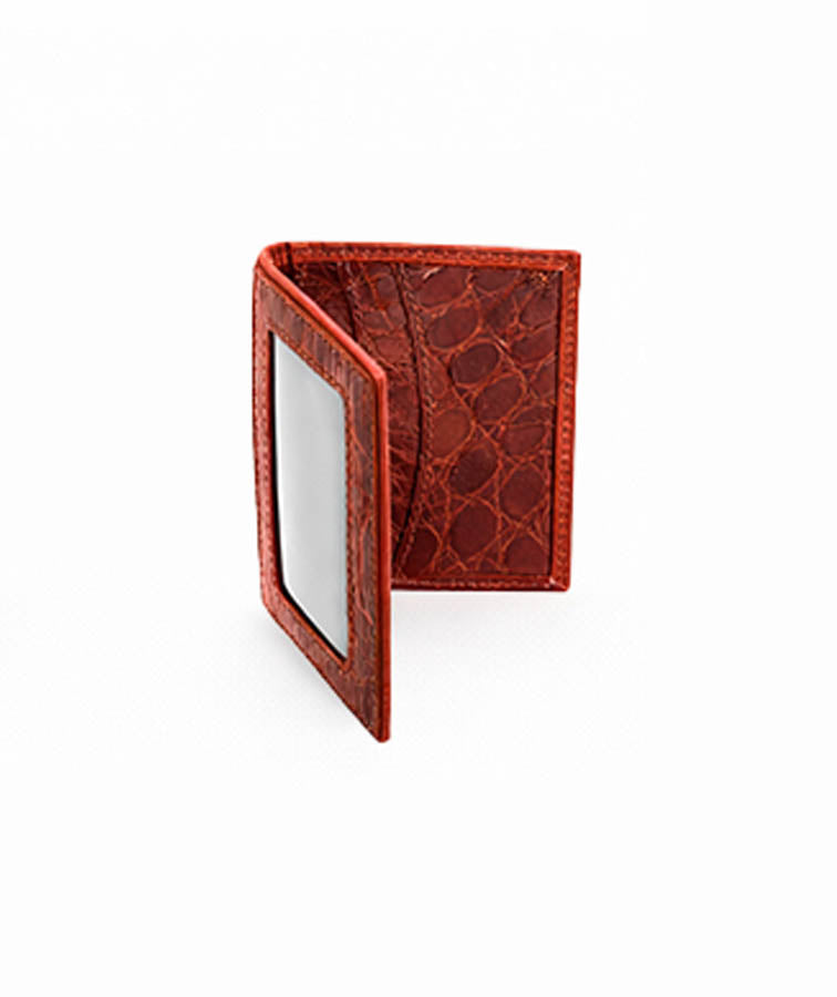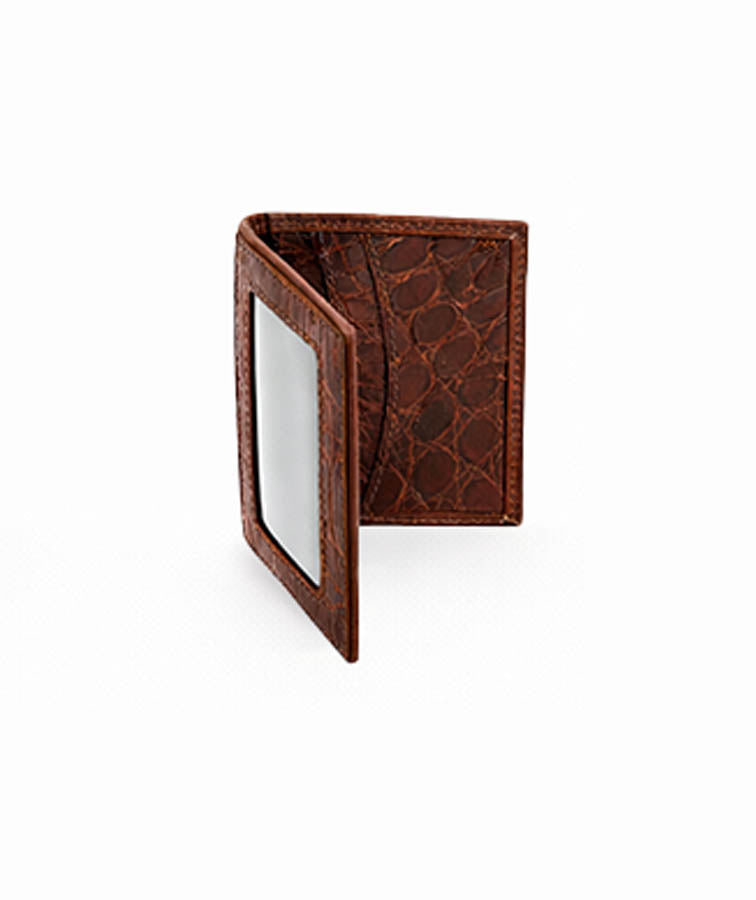 The Teramo is the perfect bi-fold cardholder handcrafted in classic Crocodile skin flanks. This "half wallet" is ideal for women or men and has an exterior slide pocket with clear plastic laminate for ID or license and multiple interior slots for cards and emergency cash. The Teramo is ideal as a knock down wallet for a small clutch or for men that loathe carrying a bulky wallet.